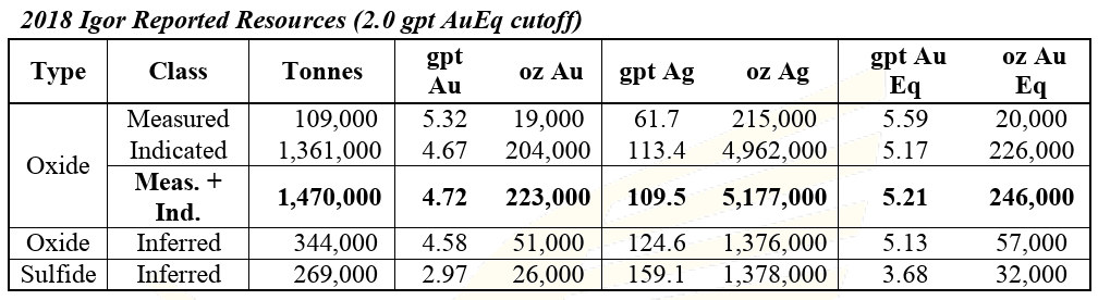 MDA developed the update mineral resource estimate for the Igor Project that has been utilized in the PFS in accordance with the requirements of Canadian National Instrument 43-101 “Standards for the Disclosure of Mineral Projects”. The resource estimate is restricted to the Callanquitas gold and silver deposit within the Igor Project. Data from a total of 93 diamond core drill holes totaling 23,264 metres in length and 1,126 underground channel samples were used to prepare the resource estimate. The estimation methodology included establishing separate domains for higher and lower grade portions of the Callanquitas deposit, utilizing geologic criteria including structure to constrain resources. Individual model blocks are 0.5m x 2.0m x 2.5m in order to mimic the proposed and current mining method. The Inverse-Distance Cubed (“ID3”) method was used to estimate sample data into the block model. As-built surveys of underground workings were used to eliminate resource blocks that have already been mined as of October, 2018. A gold equivalent (“AuEq”) cutoff grade of 2.0 gpt AuEq was used to define the reported Mineral Resources. Mineral resources are not mineral reserves and do not have demonstrated economic viability. There is no certainty that all or any part of the mineral resource will be converted into mineral reserves. The results of the mineral resource estimate are summarized below.