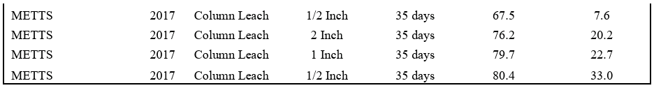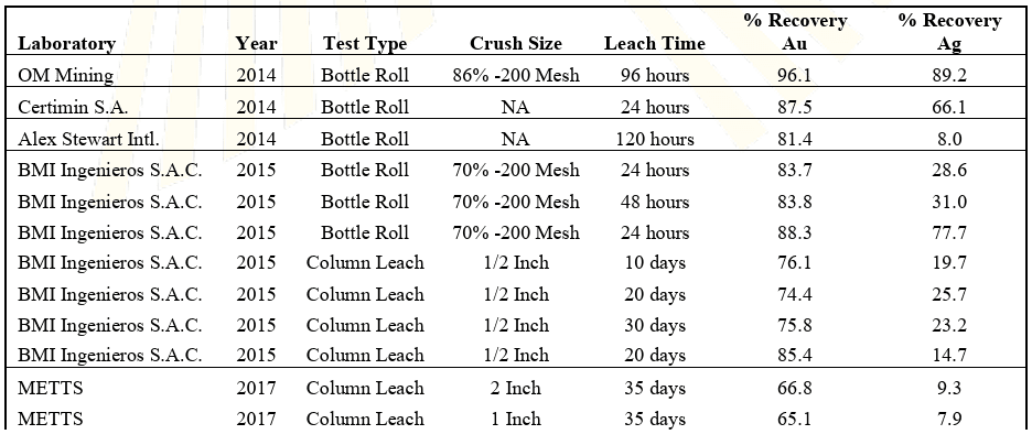 Five sets of metallurgical testing have been performed on samples from the Callanquitas deposit. The first testing was done during 2014 and 2015 and consisted of bottle roll and agitated leach tests. The results showed that Callanquitas gold and silver mineralization is amenable to CN extraction. In 2015, two sets of samples were subjected to column leach testing over a variety of leach times and utilizing agglomeration and non-agglomerated ore samples. The best results from the 2015 column leach came from ore crushed to ½ inch size with the fines agglomerated. A final set of column leach tests were performed in 2017 with similar results, the best precious metal recoveries occurred in samples crushed to ½ inch size. Gold dissolution was rapid in the 2017 test work, with most of the gold being extracted within the first five days of leaching. The opposite was true for silver, with dissolution being slow and continuing to increase throughout the 35-day leach cycle. Based on the full body of test work completed to date, the process design in the PFS considers gold recovery of 80% and silver recovery of 33% over the full leach cycle. The test work shows that silver recovery can be variable and additional testing is recommended to understand the source of this variability. Metallurgical test work is summarized below: