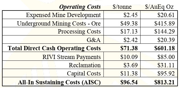 Operating costs are subdivided into direct cash operating costs and All-In Sustaining Costs (“AISC”) which include capital, reclamation, and payments to RIVI Capital for the stream financing. The PFS projects direct cash operating costs of $601/AuEq ounce and AISC of $813/AuEq ounce which would place the project near the lower quartile globally in terms of operating costs (based on World Gold Council GoldHub Q3 2018 Production Costs AISC Chart).