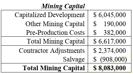 Mining Capital is mostly capitalized development over the life of the mine and adjustments (payments) to the mining contractor. Salvage at the end of mine life has been estimated at $908,000.