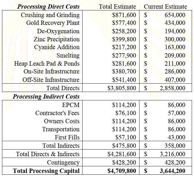 The total capital cost for the processing plant was originally estimated at $4.71M. The current remaining capital cost for the processing plant is estimated at $3.64M, including contingencies, and reflects the $1.07M expended to date.