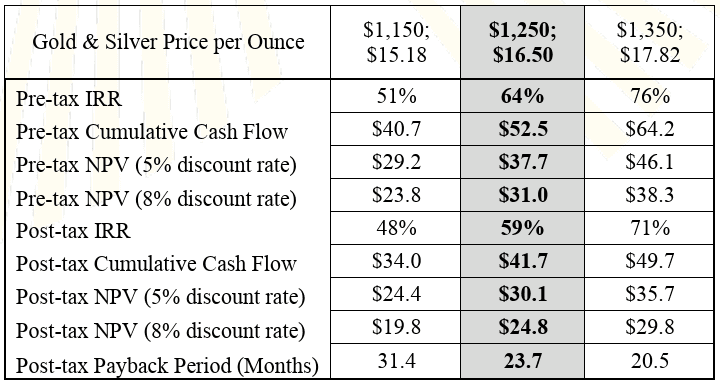 The financial analysis demonstrates a robust project, well insulated from reduced precious metal prices, with considerable upside exposure to gold and silver price increases.