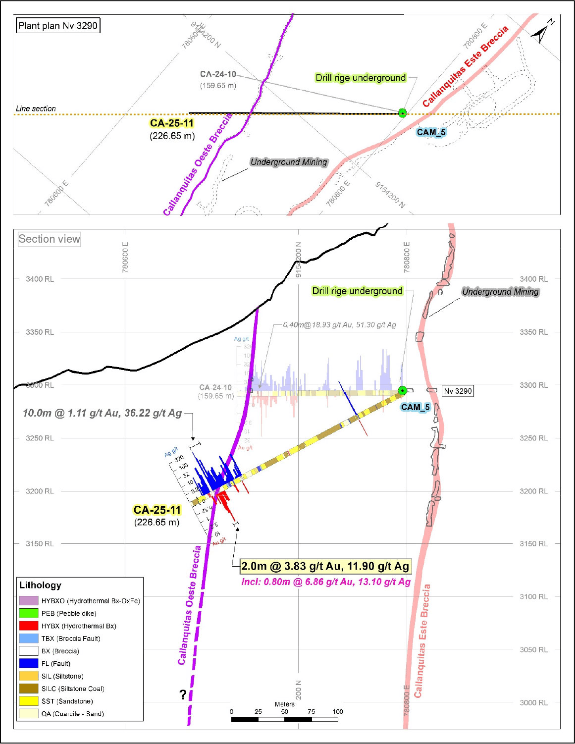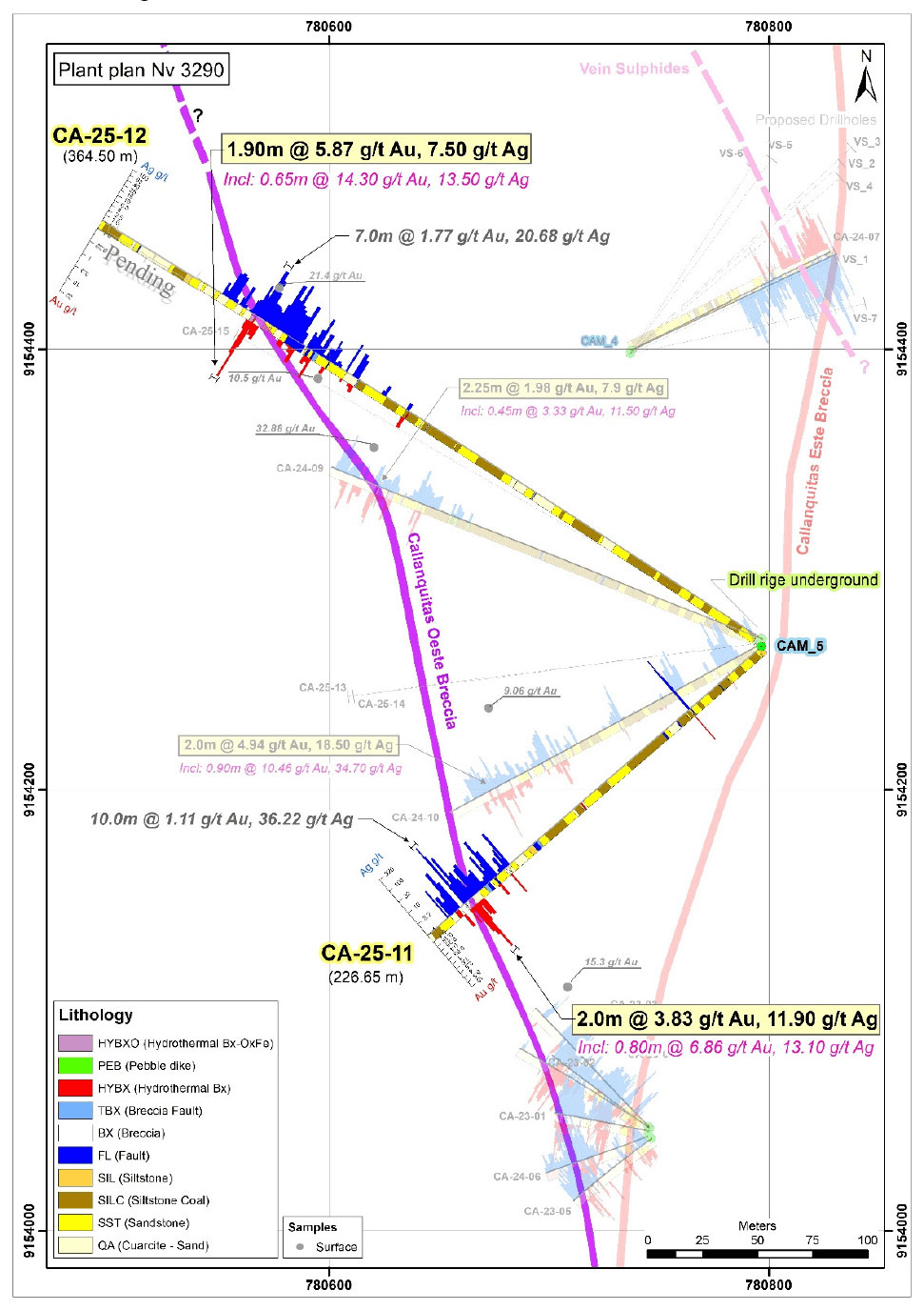 The drillholes intercepted the Callanquitas W structure, located in the northern area of the historic drilling, and carried out in 2017 and 2024. The location of the intercepts CA-25-11 are located 75 meters north of the drill hole CA-23-02 and 45 meters south of CA-24-10 and 90 meters below the drill hole CA-24-10 (See Figure 1 and 2). The intercepts of CA-25-12 are located 100 meters north of the drill hole CA-24-09 and 80 meters below the drill hole CA-24-09 (See Figure 1 and 3. Level Plan and Section). The Drill holes are drilled from underground in the mine.