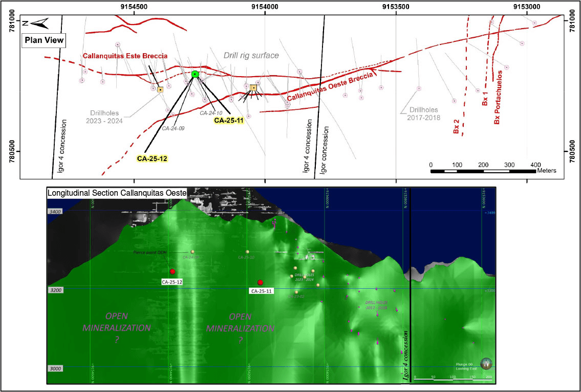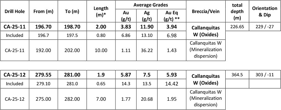 The drill hole CA-25-11 was oriented at N229° and Dip -27°; and drill hole CA-25-12 was oriented N303° dipping -11° (See Plan view – Figure 1, and Sections Figure 2 and 3). The first 204.5 meters of drill hole CA-25-11 was drilled with HQ3 drill size, but the last interval from 204.5 to 226.65 was drilled with NQ3 as the rock was very fractured. The first 256.3 meters of CA-25-12 again was drilled using HQ3 but then the final interval to 364.5 meters was drilled with NQ3 due to the fractured nature of the rock. The drill holes CA25-11 and CA-25-12 intersected the Callanquitas West Breccia and the zone of dispersed mineralization, see the intersections of mineralized zones below in the Table 1:
