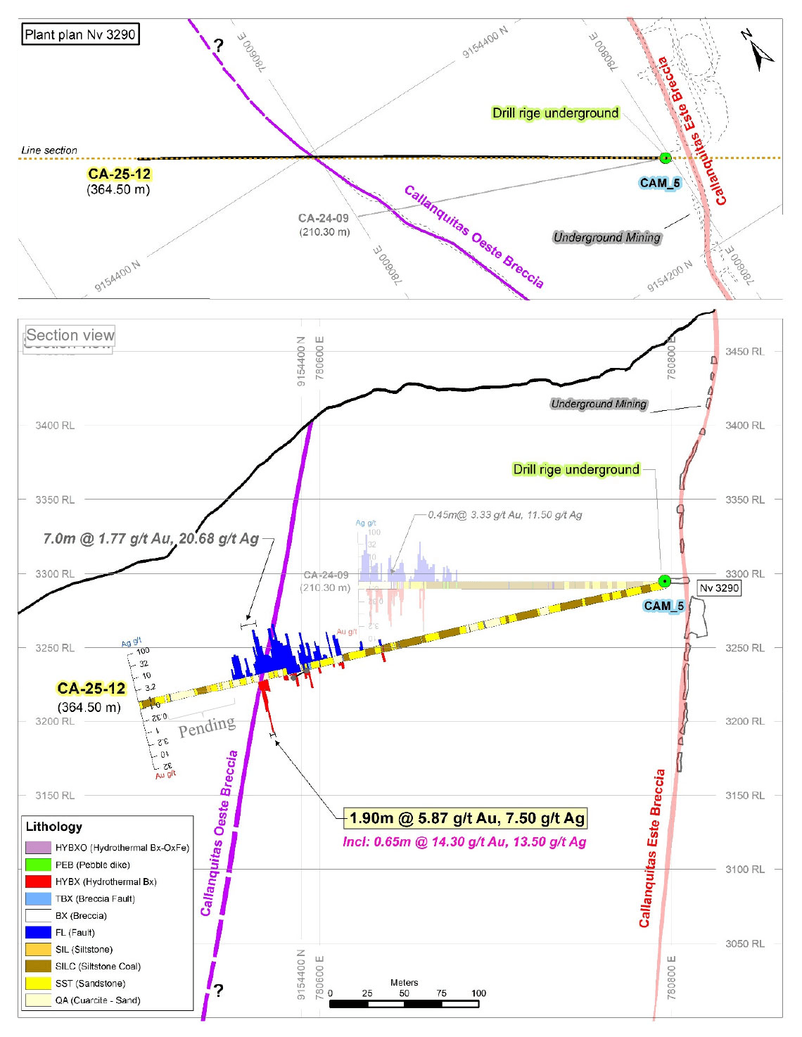 PPX, in coordination with PLP, agreed to carry out sampling of the mineralized structure with these drillholes. The sampling of the Callanquitas breccia and adjoining host rock was prioritized for these two holes. Sampling of the drill hole CA-25-11 was completed, and the drillhole CA-25-12 has some pending sample results, however these are outside of the Callanquitas structure and breccias (See sections of each drill hole Figure 2 and 3).