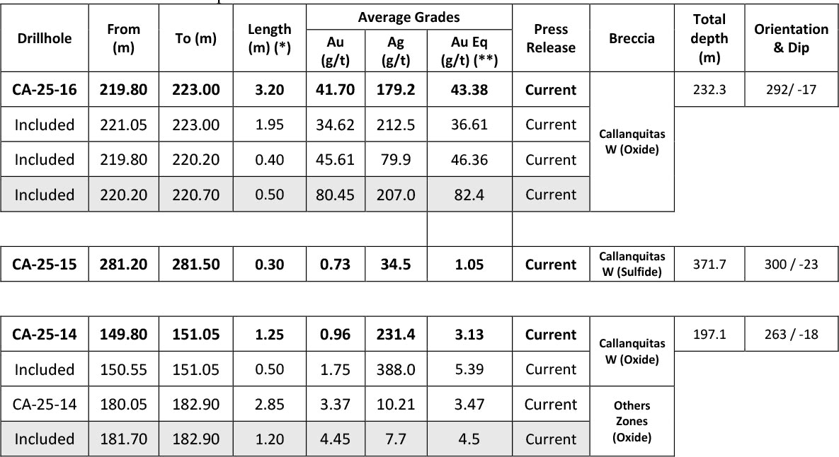 The intercepts from drillholes CA-25-14, CA-25-15 and CA-25-16 confirmed the continuity of the Callanquitas West mineralized breccia, and with high Au grades in the holes CA-25-14 (4.45 g/t Au over 1.2 meters) and CA-25-16 (41.70 g/t Au over 3.20 meters). The drillhole CA-25-15 grades 0.73 g/t Au over 0.3 meters. The silver grades in these holes are high as illustrated in the Table 1. The drillhole CA-25-16 was not completed due to mechanical limitations of the drilling machine and lithological complications.