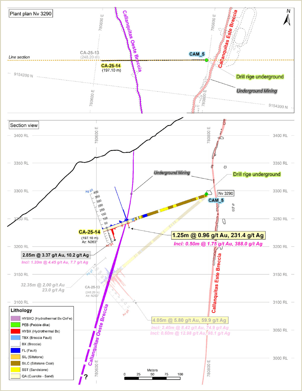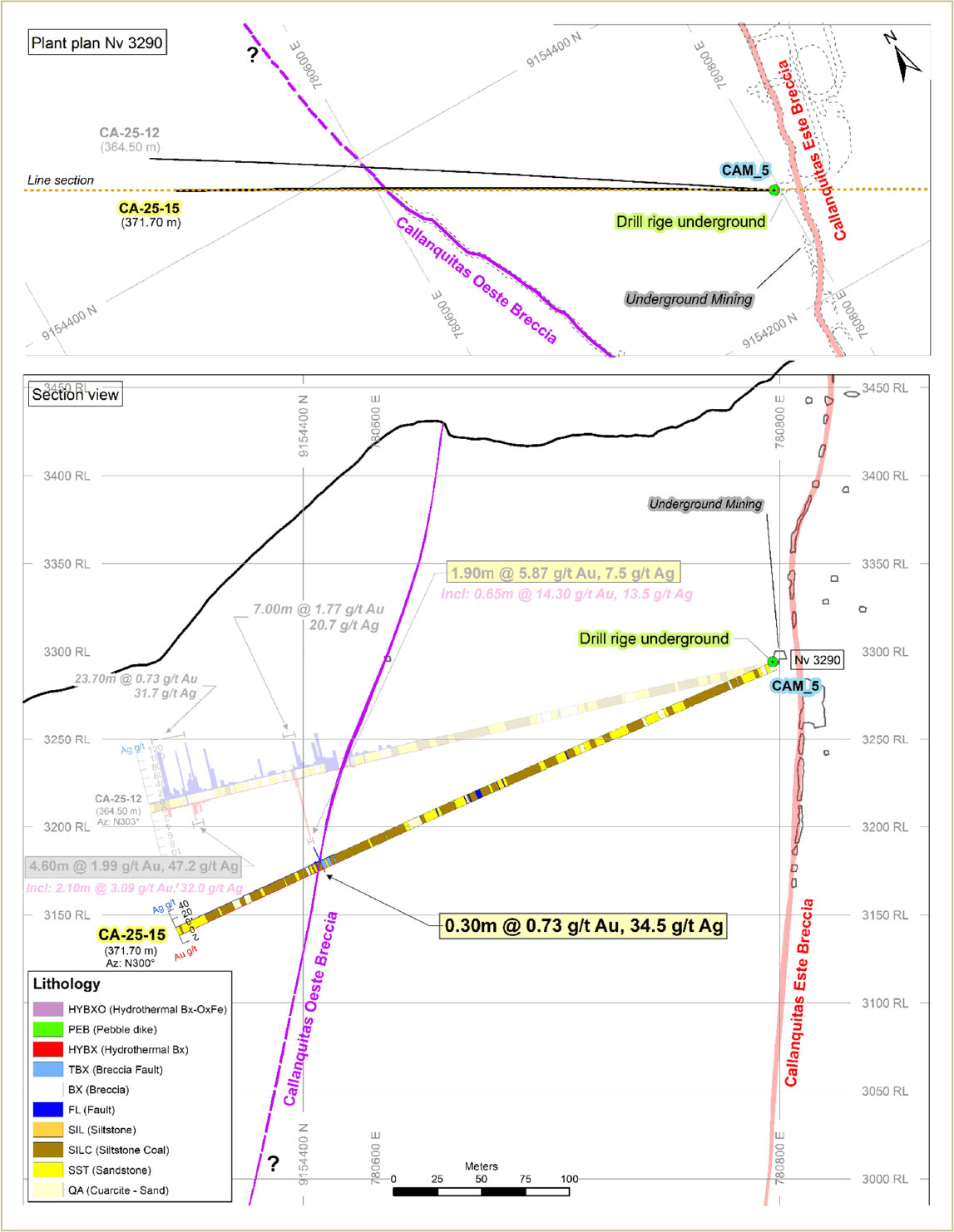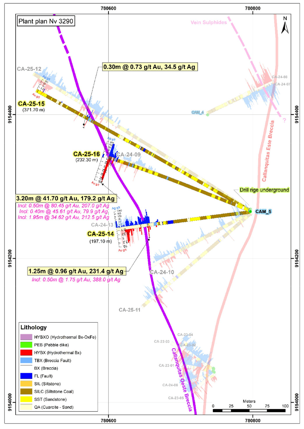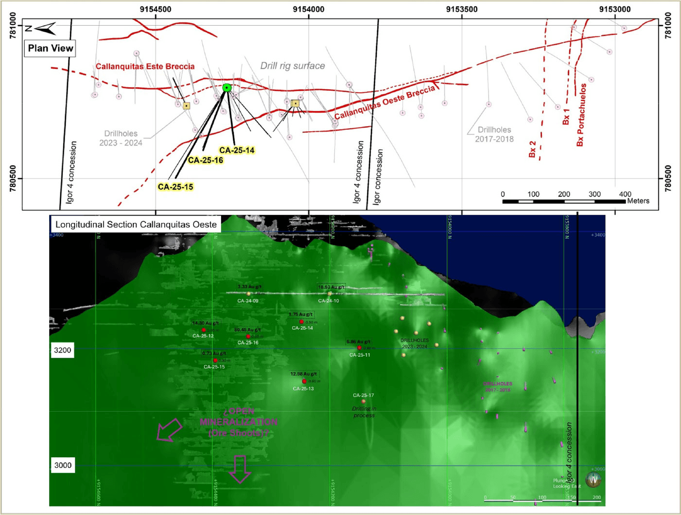 The drillholes were drilled as follows, CA-25-16 oriented at N292°E plunging -17°, CA-25-15 oriented N300°E plunging -23°; and CA-25-14 oriented N263°E plunging -18° (See Plan View Figure 1, and Sections Figure 2, 3 and 4). The drillholes CA-25-16, in the oxide zone, CA-25-15 in the sulfide zone, and CA-25-14 in the oxide zone, all intersected the Callanquitas West Breccia. The drillhole CA-25-14 also intersected a second parallel structure grading 3.37 g/t Au and 10.2 g/t Ag over 2.85 meters. Best mineralized intersections are presented below in the Table 1.