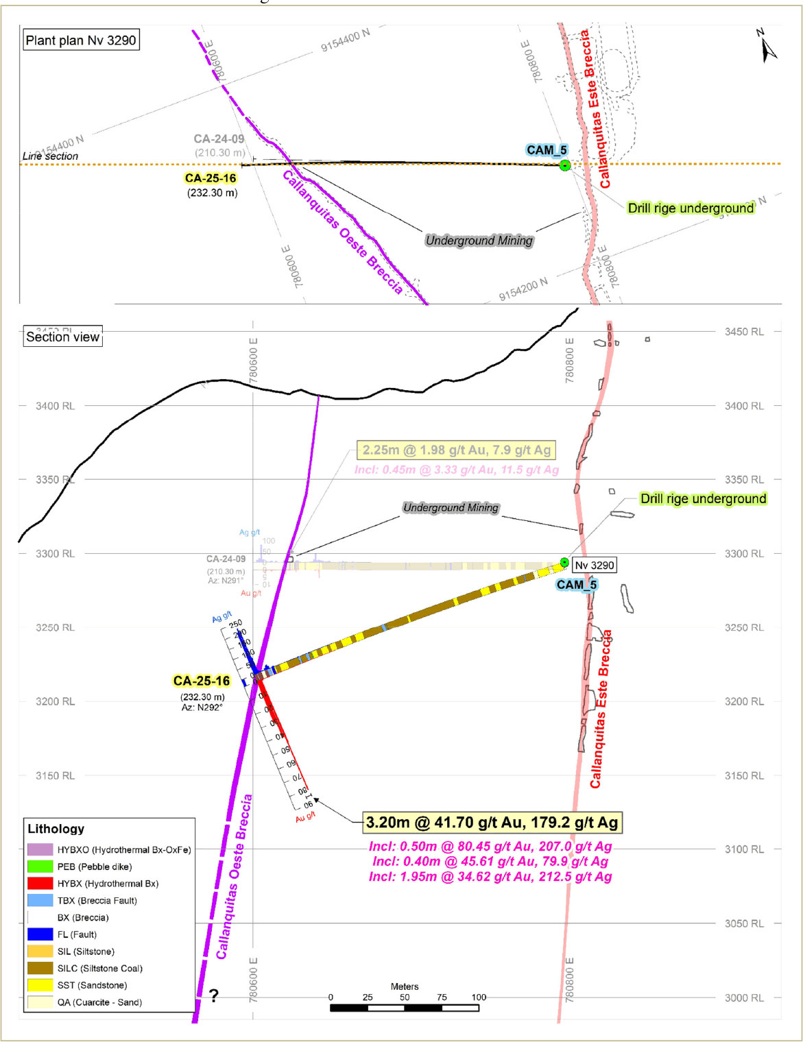 The results in hole CA-25-16 with the high Au grades in Callanquitas West structure, supports the idea of a similar mineralizing style as in Callanquitas East. An improvement in the mineralization seen in the drill holes CA-25-16 and CA-25-13 (Press Release May 2025) appear to demonstrate the presence of an ore shoot with a breccia thickness of greater than 2 meters.