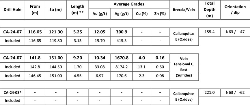 John Thomas, CEO, commented: “The results of CA-24-07 encourage us to continue drilling below the mined area of Callanquitas East. The ore appears to continue at depth with good grades of Au and Ag in an oxidized breccia. In addition, drill hole CA-24-07 showed the presence of a sulfide vein with spectacular grades in Au, Ag and Cu, in addition to good thickness, having the highest value in terms of contained metals ever obtained from the Igor concessions. This vein represents a new target for future drilling. Work planned to expand the resources for both Callanquitas East and West will continue, based on these excellent results. The Company is designing a second phase of drilling at Callanquitas for the first quarter of 2024, with the objective of defining the definitive geometry of the Au and Ag precious metals mineralization.”