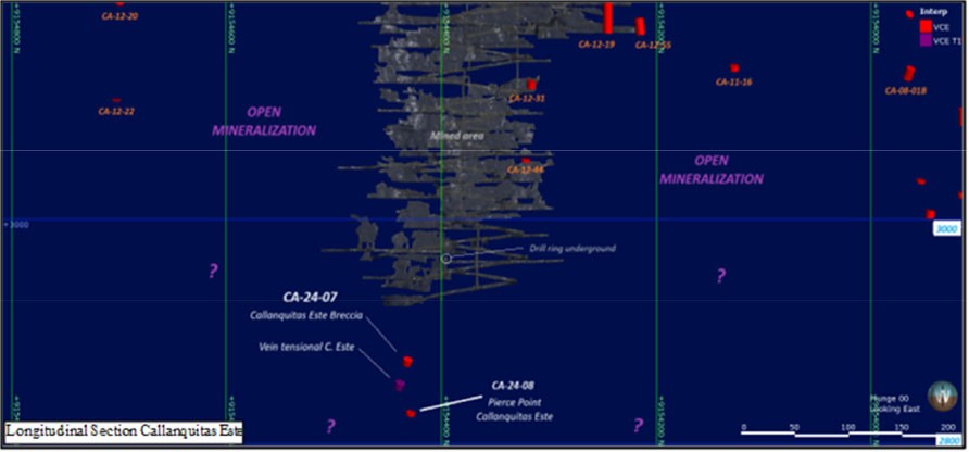 The drillholes intercepted the Callanquitas East structure, and are located to the north and below the area of the historic drilling carried out in 2018, at a depth of 2970 mal. The location of these new intercepts is located more than 50 meters below the mined areas (see longitudinal section below of Mina Callanquitas), the nearest historical drilling is CA-12-44.