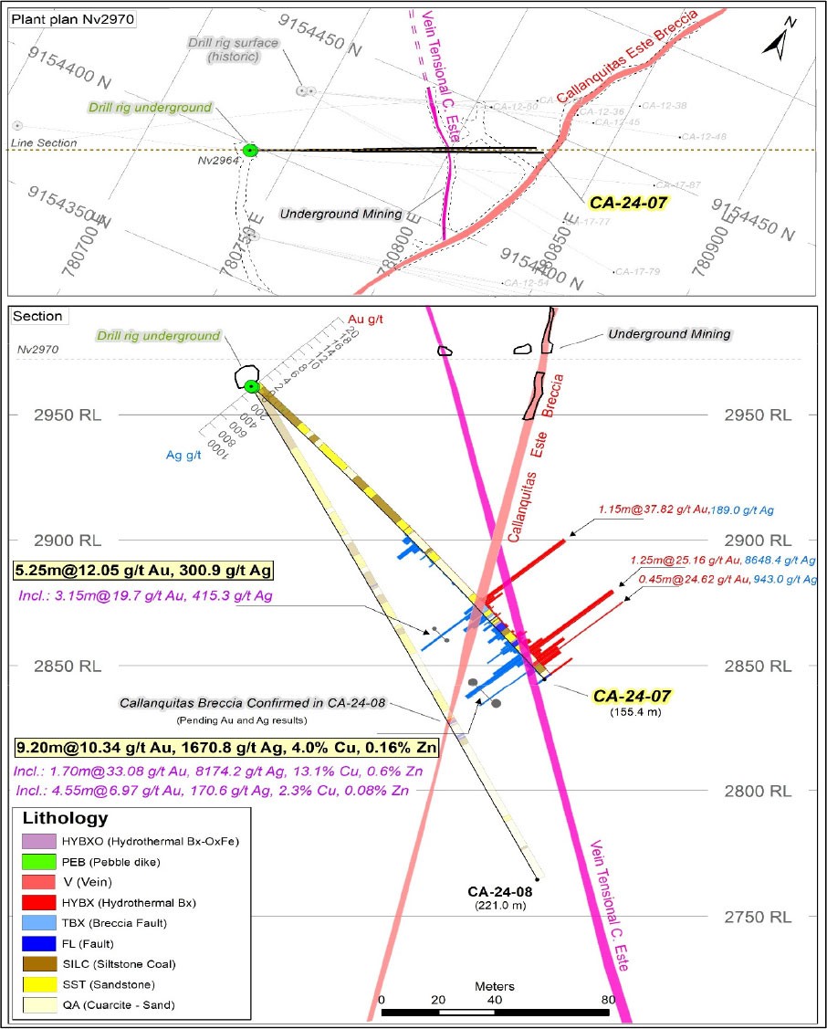 The drill hole CA-24-07 also intercepted an important and well mineralized sulfide vein with high grades of Au, Ag and Cu, over good intercept lengths. The original vein is replaced by massive sulfide intergrowths with quartz. This vein intersects the Callanquitas East breccia, and with the appearance of a tensional system with an approximate orientation of N320 dipping -75 degrees. This vein (with oxides) was located in the upper mining levels of the Mina Callanquitas.
