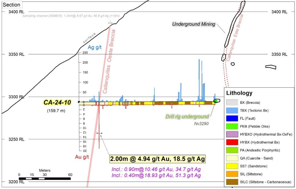 Drillhole CA-24-10 was located towards the new areas of the Callanquitas West breccia and south of hole CA-24-09, at 90 meters from the surface. Drillhole CA-24-10 intersected the Callanquitas West breccia at the elevation of 3290 m and with abundant iron oxides. The hole was drilled from an open stope with an azimuth of 241° dipping 0° (horizontal). The breccia zone also showed several hydrothermal sections and intersected 10.46 g/t Au and 34.7 g/t Ag over 0.9 meters within the wider intersection grading 4.94 g/t Au and 18.5 g /t Ag over 2.00 meters, with an intercept grading up to 18.93 g/t Au, as shown below: