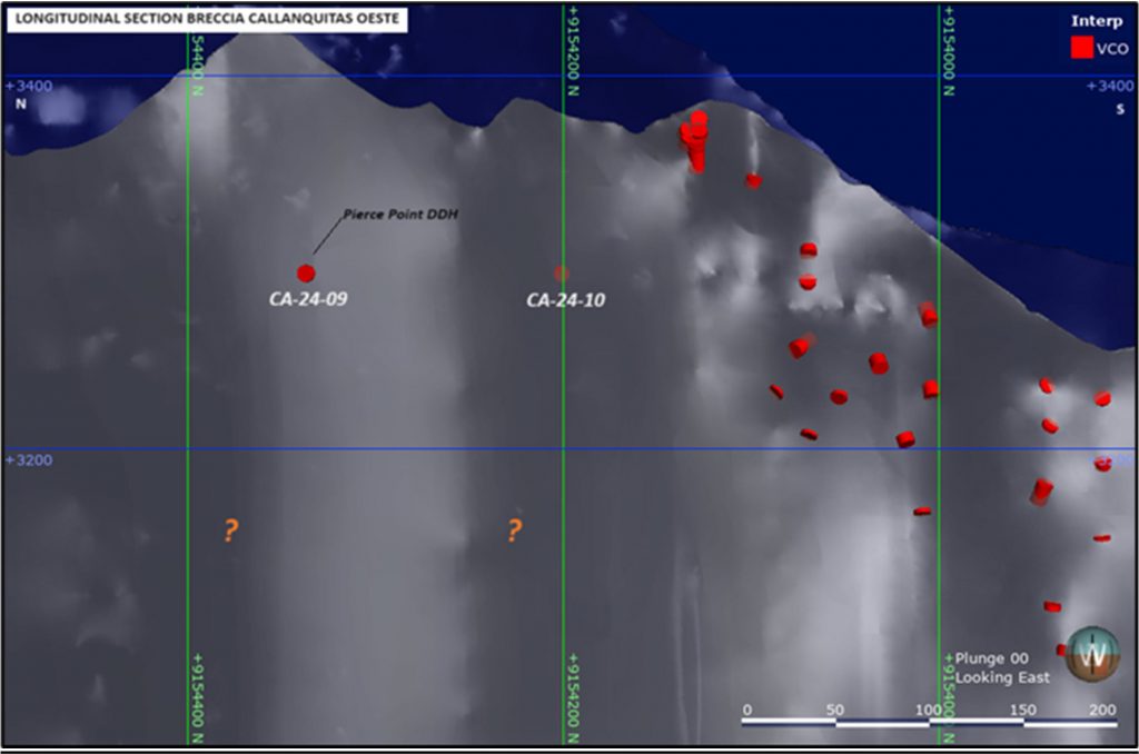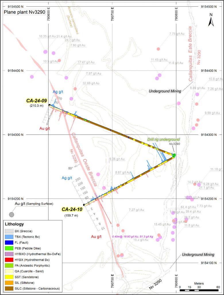 Two holes (CA-24-09 and 10) were drilled to intercept Callanquitas West. The drillholes were positioned from underground at level 3290 m, a new area with no historical drilling nearby, with an estimated length of 350 meters long and open at depth (see longitudinal section). The holes were located at the northern part of the Callanquitas West breccia as shown in the below figure: