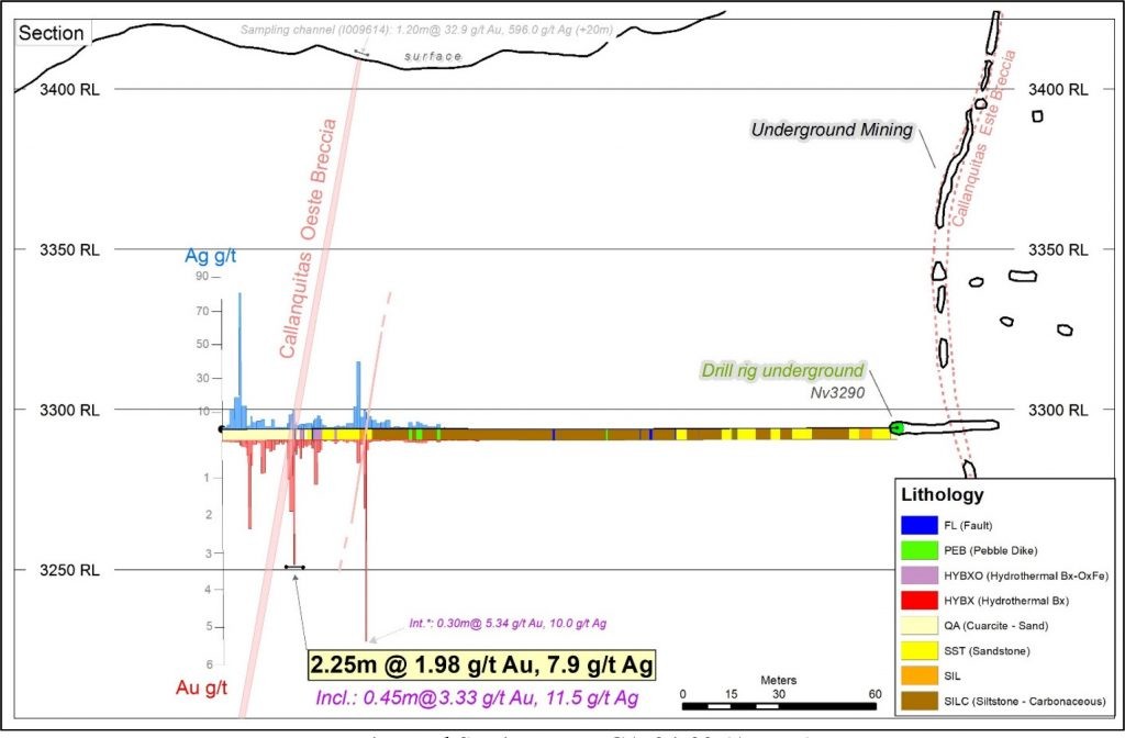 Drilled towards the new areas of the Callanquitas West breccia and at 100 meters below the surface. The drilling intersected the Callanquitas West breccia at the elevation 3290 m with abundant iron oxides. The hole, drilled from an underground stope had an azimuth of 261° dipping 0° (horizontal). The breccia zone intersected has several hydrothermal features with intersections grading 5.34 g/t Au and 10 g/t Ag over 0.3 meters wide, and another thicker breccia grading 1.78 g/t Au and 7.9 g/t Ag over 2.25 meters (see section below).