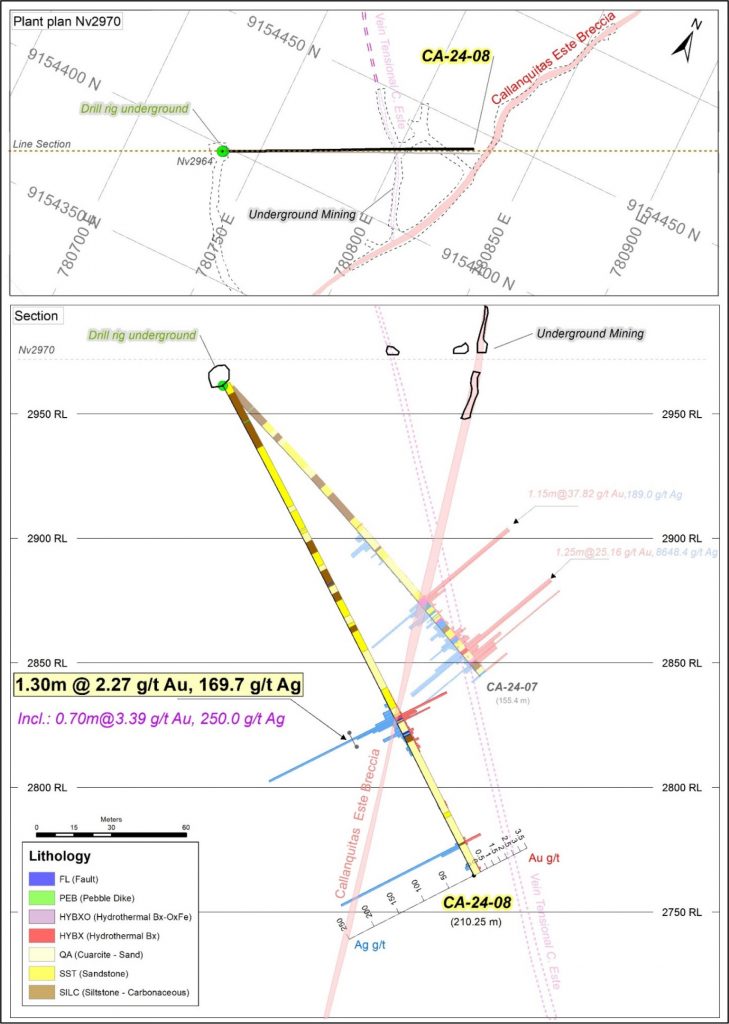 Drillhole CA-24-08 intersected the Callanquitas East structure, located below and north of the historic drilling carried out in 2018, at level 2970 m. The new intercept is 100 meters from the mining area (Mina Callanquitas) and the nearest drillhole is CA-24-07.
