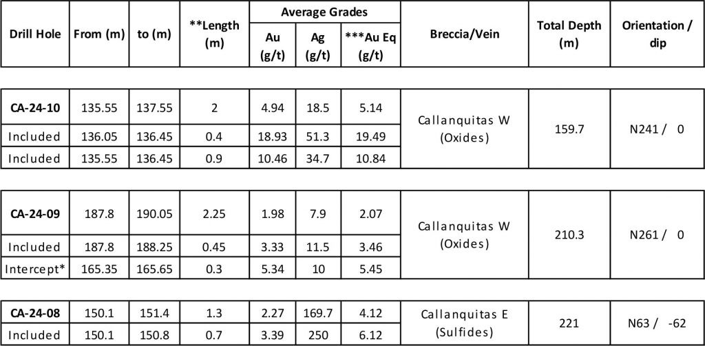 John Thomas, CEO commented, “The results of CA-24-08 confirm continuity of the Callanquitas East breccia at an elevation of 2830 m, well below the present mining area, and with economic grades of Au and Ag within mixed oxides and sulfides. Additionally, the drillholes CA-24-09 and CA-24-10 that intercepted Callanquitas West are located in a new area, with no historical drilling. Both holes confirm the continuation of the gold mineralization as expected from the surface sampling. The distance between the intersections is 350 meters and does indicate the need for more drilling to confirm this strike length and continuity.
