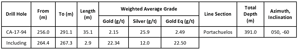 Callanquitas In-Fill Drilling: Diamond core drilling at the north end of the Callanquitas gold and silver resource area has intercepted a new zone of mineralization on the Callanquitas structure: 3.0m grading 7.11 gpt Au, 9.6 gpt Ag (7.24 gpt Au Eq). This drill hole (CA-18-95) cut the Callanquitas structure 50 metres vertically below the pierce point of drill CA-18-93, a drill hole that returned no significant assay values. Drill hole -95 therefore opens up a new area of higher grade gold and silver mineralization on the Callanquitas structure; it should be noted that in adjacent drill sections, high grade gold and silver extends to depths almost 200 metres below the intercept reported here. An additional drill hole has been added to the Callanquitas in-fill drilling program to test the down-dip extension of this high grade intercept.