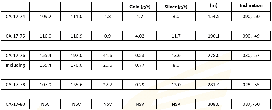 Scout drilling on the Callanquitas Structure: Three “scout” diamond drill holes were completed along the 500 metre southerly projection of the Callanquitas structure. This is an area of limited outcrop and the drill holes were designed to test areas of post-mineral cover in order to confirm the position of the Callanquitas structure and more accurately target additional drill holes. Two of the drill holes successfully cut the Callanquitas structure; CA-17-74 cut 1.8 metres grading 1.70 gpt Au and 3.0 gpt Ag and CA-17-75 that intercepted 0.9 metre grading 4.02 gpt Au and 11.7 gpt Ag. PPX will utilize this data to refine drill targets on this segment of the Callanquitas Structure to target the higher-grade, raking zones of gold-silver mineralization that characterize the Callanquitas resource area.
