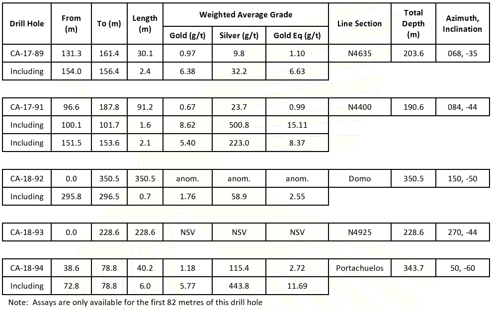 Callanquitas In-Fill Drilling: Two in-fill drill holes were completed within the Calanquitas resource area: CA-17-89 intercepted 2.4 metres grading 6.38 gpt Au, 32.2 gpt Ag (6.63 gpt Au Eq) while CA-1791 had multiple high grade intercepts including 1.6 metres grading 8.62 gpt Au, 500.8 gpt Ag (15.11 gpt Au Eq) and 2.1 metres grading 5.40 gpt Au, 223.0 gpt Ag (8.37 gpt Au Eq). These intercepts confirm grade continuity in this portion of the Callanquitas structure and will be utilized in the forthcoming PreFeasibility Study (“PFS”) for Mina Callanquitas. As has been noted in previous drill holes, the high grade intercepts in CA-17-89 and -91 are within thick intervals of lower grade mineralization. At the northern end of the Callanquitas system, drill hole CA-18-93 was positioned where a drill hole pierce point was necessary to verify a pinching portion of the Callanquitas structure outside the resource area therefore, the lack of significant values (“NSV”) was somewhat expected.