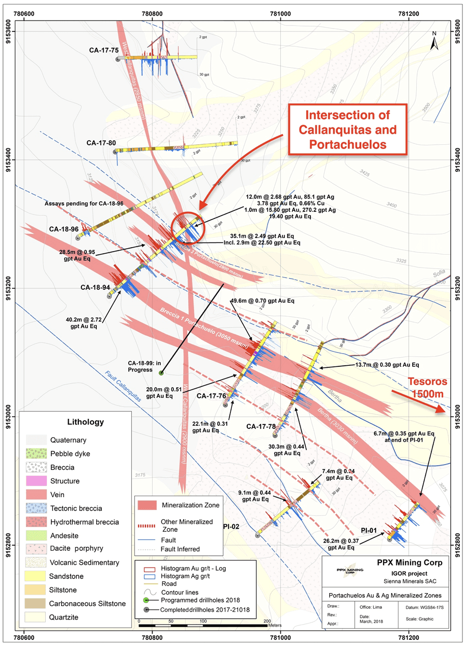 Brian J. Maher, President and CEO of PPX Mining commented: “Identifying the joining intersection between two large gold and silver systems, Callanquitas and Portachuelos, has major implications for the future exploration and development of the Igor Project: What were once considered to be two separate and individual deposits, now appear to be merging into a single, very large hydrothermal system with considerable exploration upside. The Company intends to aggressively explore the entire Igor project, including the joined Callanquitas and Portachuelos deposits, Tesoros, and Domo in the months ahead.”.