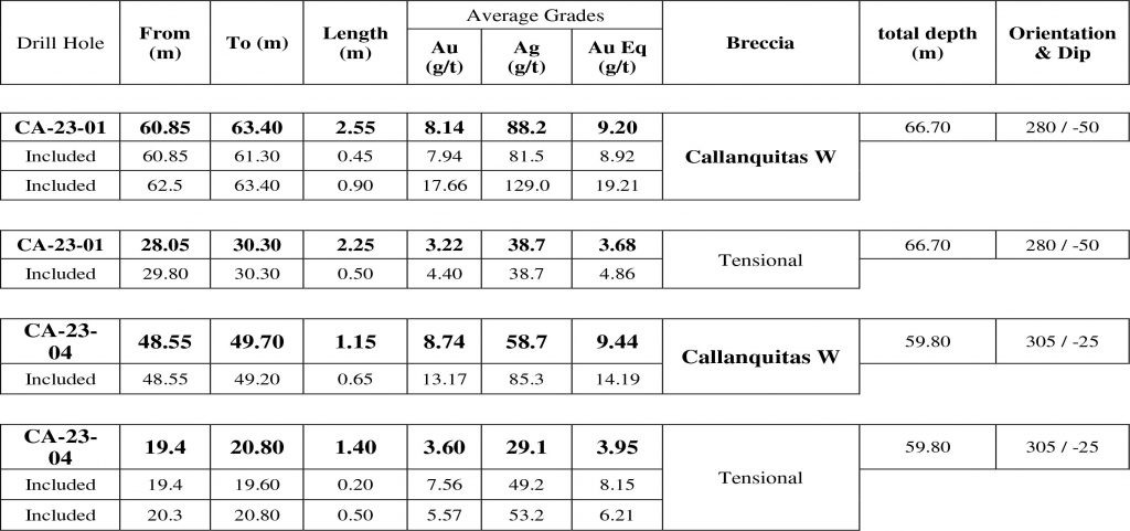 The intercepts from drillholes CA-23-01 and CA-23-04 confirmed the continuity of the mineralization with high Au grade and Ag content of approximately 2 ounces per ton. These grades shown in Table 1 demonstrate that mineralization extends and continues in this area.