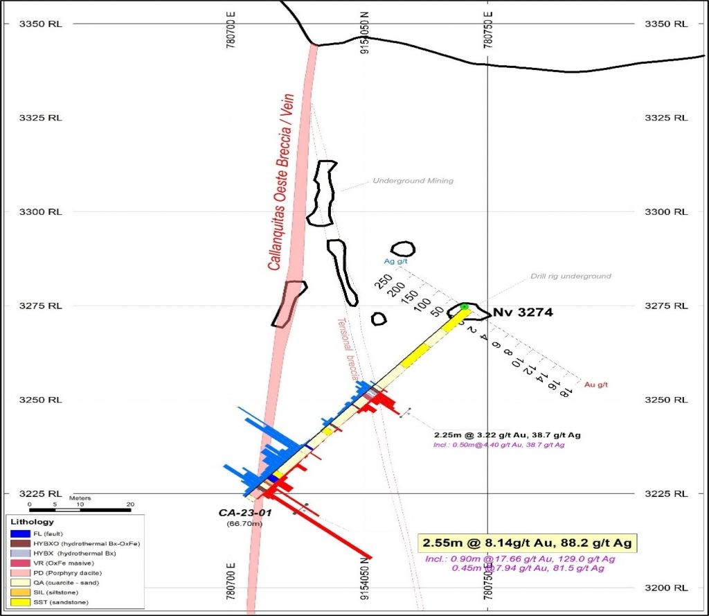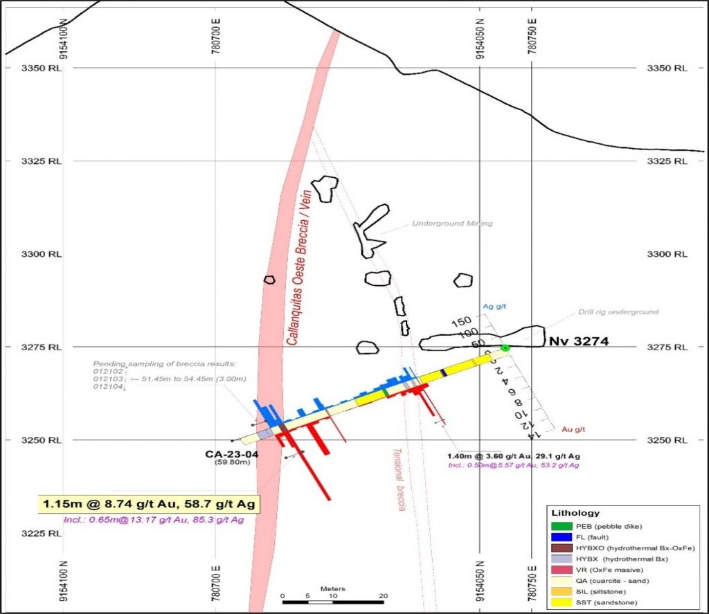 PPX, in coordination with PLP, agreed to carry out sampling of the mineralized areas of the structure with these drillholes in the current drilling program, and by prioritizing the Callanquitas breccia and adjoining host rock. Sampling in the drill hole CA-23-01 was completed; and drill hole CA-23-04 has sample results still pending. (See sections of each drill hole).