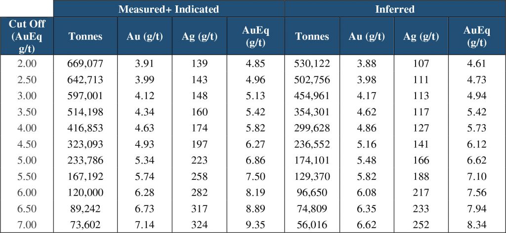 The Mineral Resource is reported inside underground optimized shapes with a reasonable cut-off grade of 2.00 g/t gold equivalent, based on a gold price of US$1800/oz and silver price of US$20/oz, mining costs and metallurgical recovery from the current mining activities.