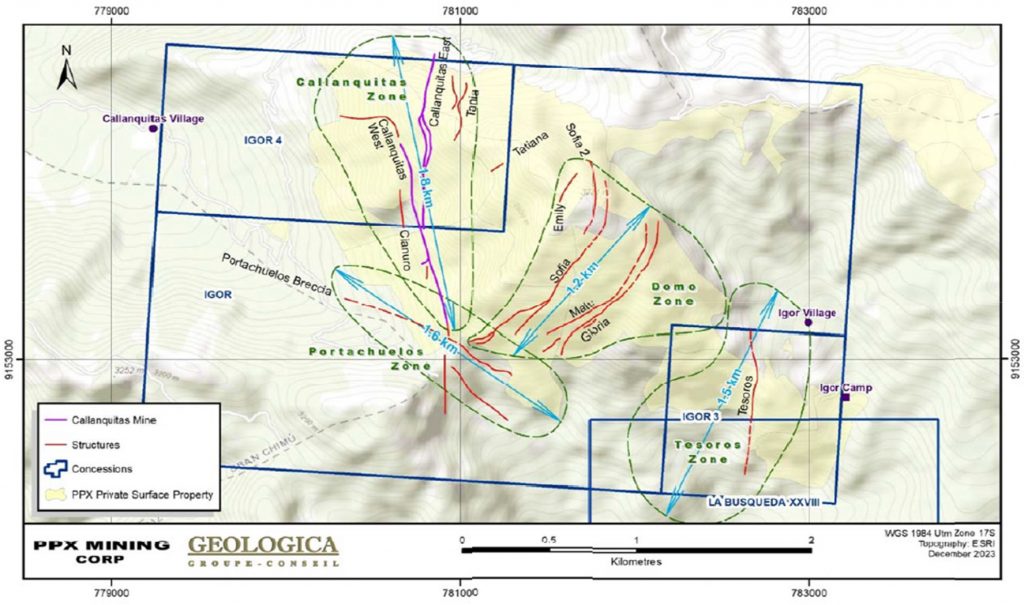 Geologica Groupe-Conseil Inc. (Geologica) has recently conducted evaluations of the geological potential in the three main mineralized zones (Portachuelos, Domo, and Tesoros). Geologica acknowledges that the exploration efforts undertaken by PPX have been adequately executed, employing exploration techniques and methodologies that align with standard practices in the mining industry. The location of these three zones is shown in figure 3. below.