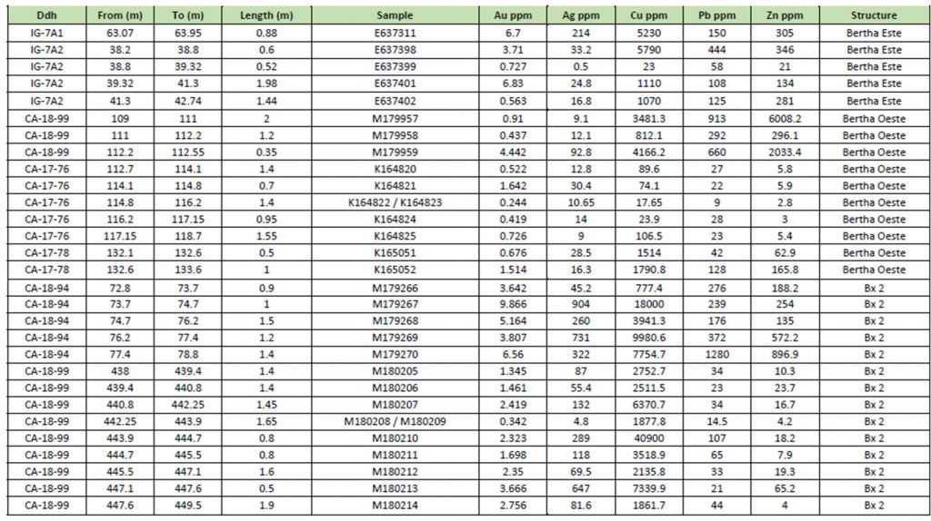 Table 2: Most significant diamond drill hole intersections for the Portachuelos zone