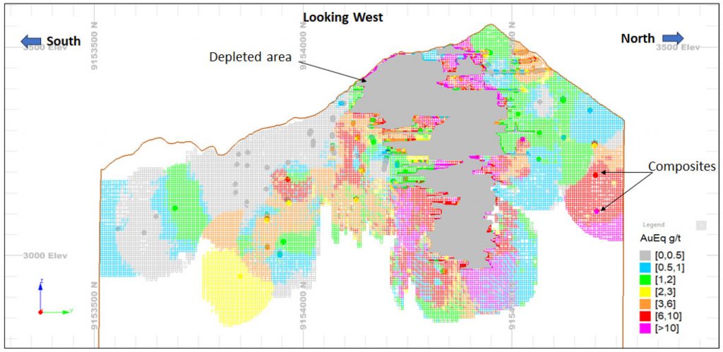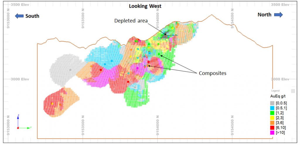 Figure 2: Longitudinal Section with composites and block model coloured by gold equivalent grade – Callanquitas West