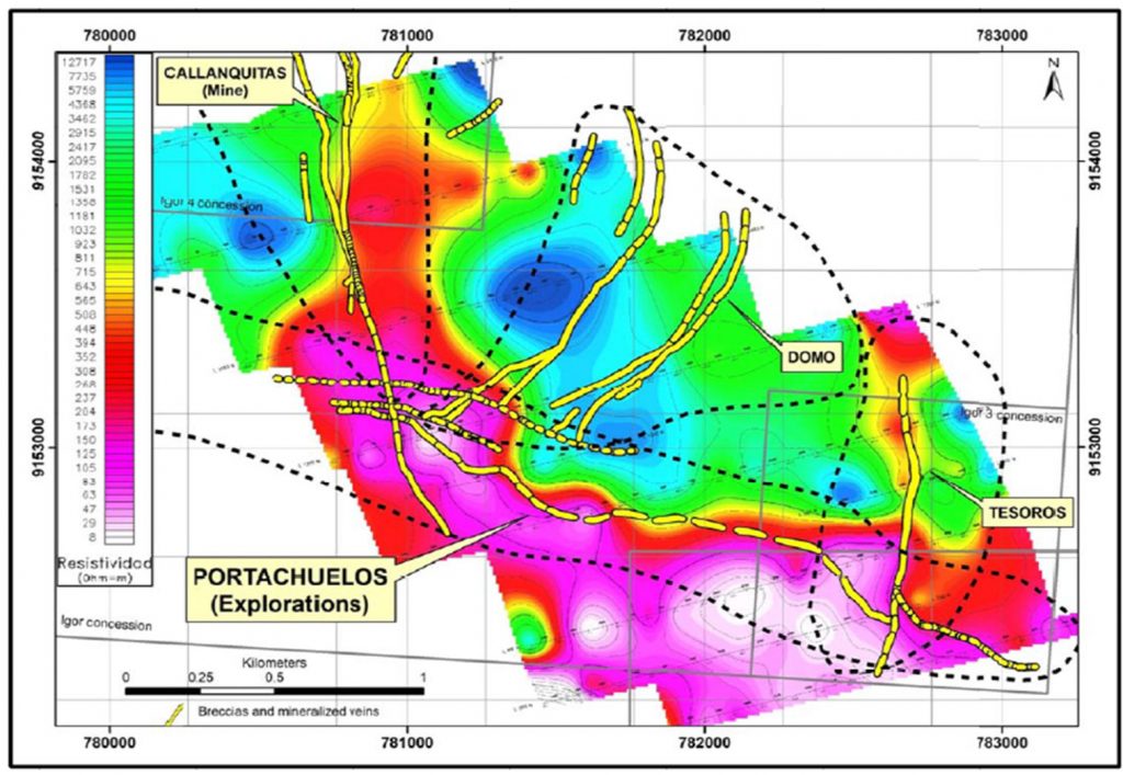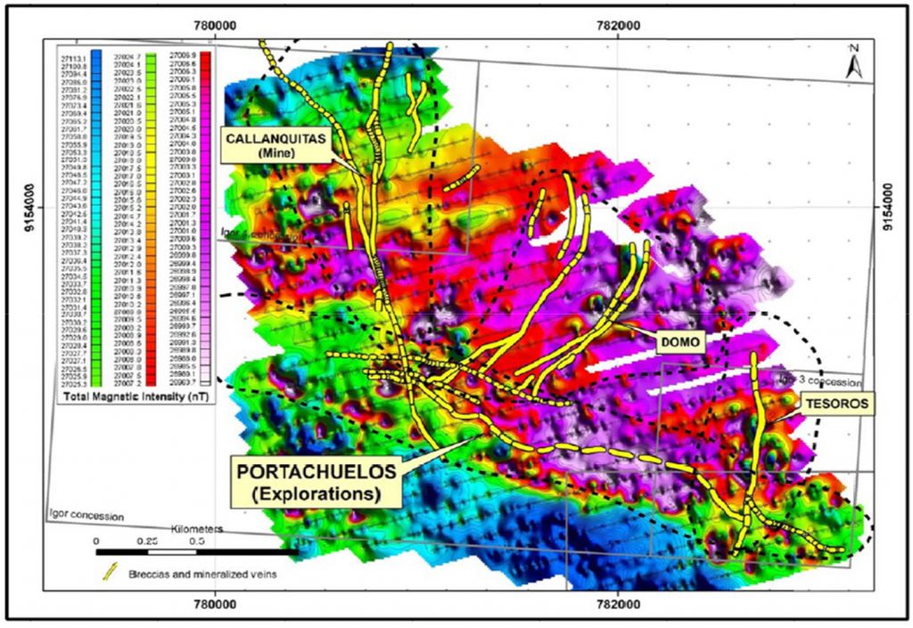These mineralized structures show good width from 2 m to 5 m and lateral length extensions from 1.2 km to 2.0 km and are hosted within brecciated and fractured quartzites of the favourable Chimu-Santa Formations and transition zones. The mineralization was injected within altered fractures, faults, fold flanks (mantos) and fold noses. The hot fluids were carrying metal ions from deeper within the intrusion or intrusive magma and formed epithermal veins once cooled. Just like at Callanquitas mine, depth extensions of the three zones (Portachuelos, Domo & Tesoros) could reach 500 meters or more and be open along strike.