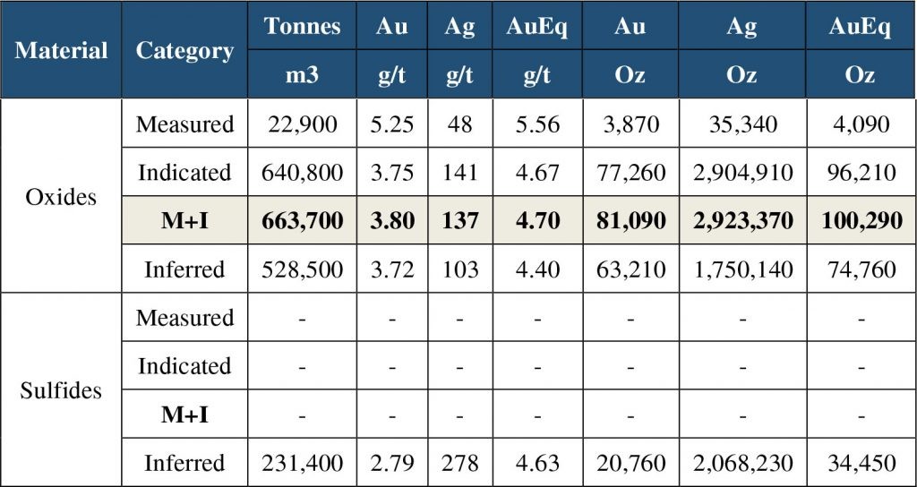 As of September 30, 2023, the MRE includes Measured, Indicated, and Inferred Resources; as Measured and Indicated resources in Oxides, there are around 663,700 tonnes with a gold equivalent grade of 4.70 g/t, with a metal content of 100,290 ounces of gold equivalent, and as Inferred in oxides there are around 528,500 tonnes with a gold equivalent grade of 4.40 g/t, with a metal content of 74,760 ounces of gold equivalent.