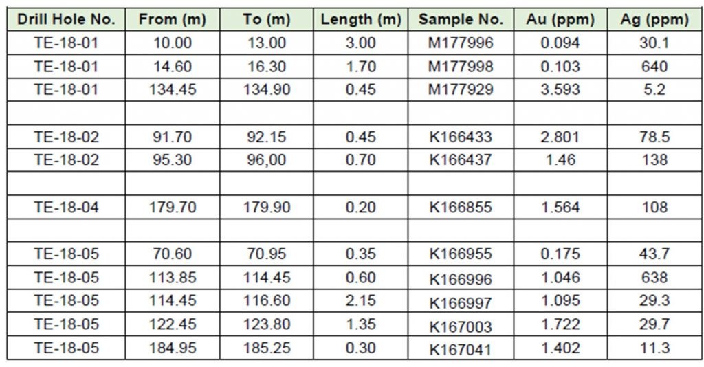 Drill core sampling of the 3 areas has confirmed the mineralization present with grades above 1 g/t ranging from 1.06 g/t to 19.11 g/t Au and silver grades up to 560.94 g/t Ag over widths of 1.04 m to 9.05 m. The channel sampling at the surface has also confirmed the mineralization presence in the three areas with grades above 1 g/t Au ranging from 1.14 g/t to 4.50 g/t Au and silver grades up to 209.00 g/t Ag over channel widths of 0.5 m to 3.8 m. The drill holes have illustrated higher gold grades at depth and were observed in the sampled drill holes and surface channel sampling. The most significant diamond drill hole intersections for the Tesoros zone are shown in Table 3, those for Portachuelos in Table 4.