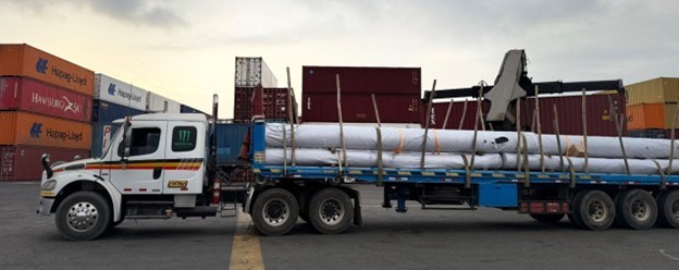 The earthworks are finished, and the installation of the drainage system is about to begin. The first shipment of geotextiles and geomembranes, purchased from China, has arrived in Peru and is being transported to the project site.
