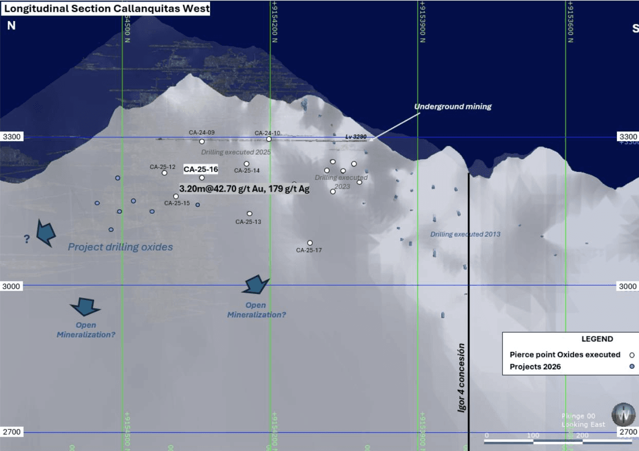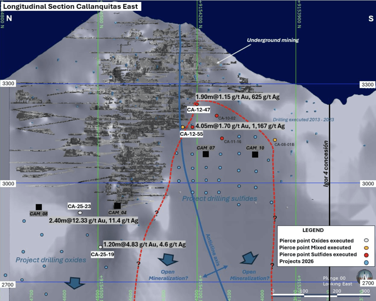 PPX plans to initiate underground exploration drilling at its Callanquitas East Mine in June 2026 with two drills. One drill will target the oxide zone the other will target the sulfide zone. The oxide zone exploration will target step outs from holes CA-25-23, 2.40m of 12.33 g/t Au and 11.4 g/t Ag, CA- 25-19, 1.20m of 4.83 g/t Au and 4.6 g/t Ag extending the areas close to zones that are currently being mined. To date, only four holes have been drilled in the Callanquitas sulfide zone, which lies south of and beneath the previously mined oxide zones in Callanquitas East. All four of the previous Callanquitas East sulfide drill holes were drilled in 2012 or earlier with grades above cut-off. The holes close to the interface with Callanquitas East were high in silver such as CA-12-55, 4.05m of 1.70 g/t Au and 1,167 g/t Ag, and CA-12-47, 1.90m of 1.15 g/t Ag and 625 g/t Ag.
