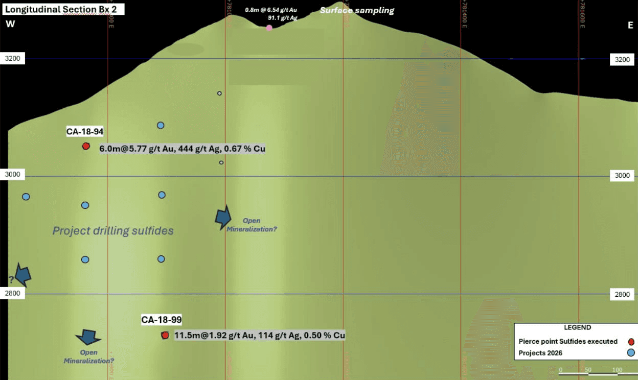 The company plans to submit its surface exploration permit for Portachuelos via the FTA (Ficha Tecnica Ambiental) process in June 2026. The target at Portachuelos will be the BX2 structure that was last drilled in 2018. BX2 only has two drill intercepts to date. Both intercepts show high grade mineralisation with CA-18-94 of 6.0 m, 5.77 g/t Au. 444, g/t Ag, and 0.67% Cu and CA-18-99 with 11.5 m of 1.92 g/t Au, 114 g/t Ag and 0.50% Cu. The intercepts are separated by approximately 300 meters. Upon the completion of the drill program the Company will be in a position to determine an internal resource of the BX2 vein. The Portachuelos drilling will be supported with downhole EM surveys to characterise the response of the different Portachuelos structures to this geophysical method.