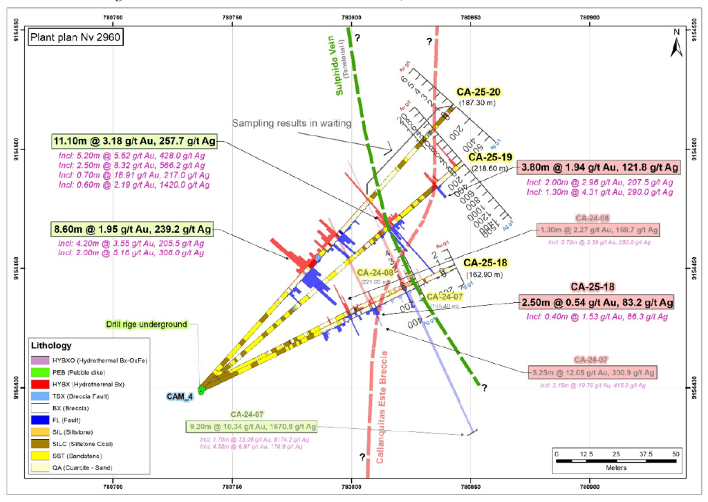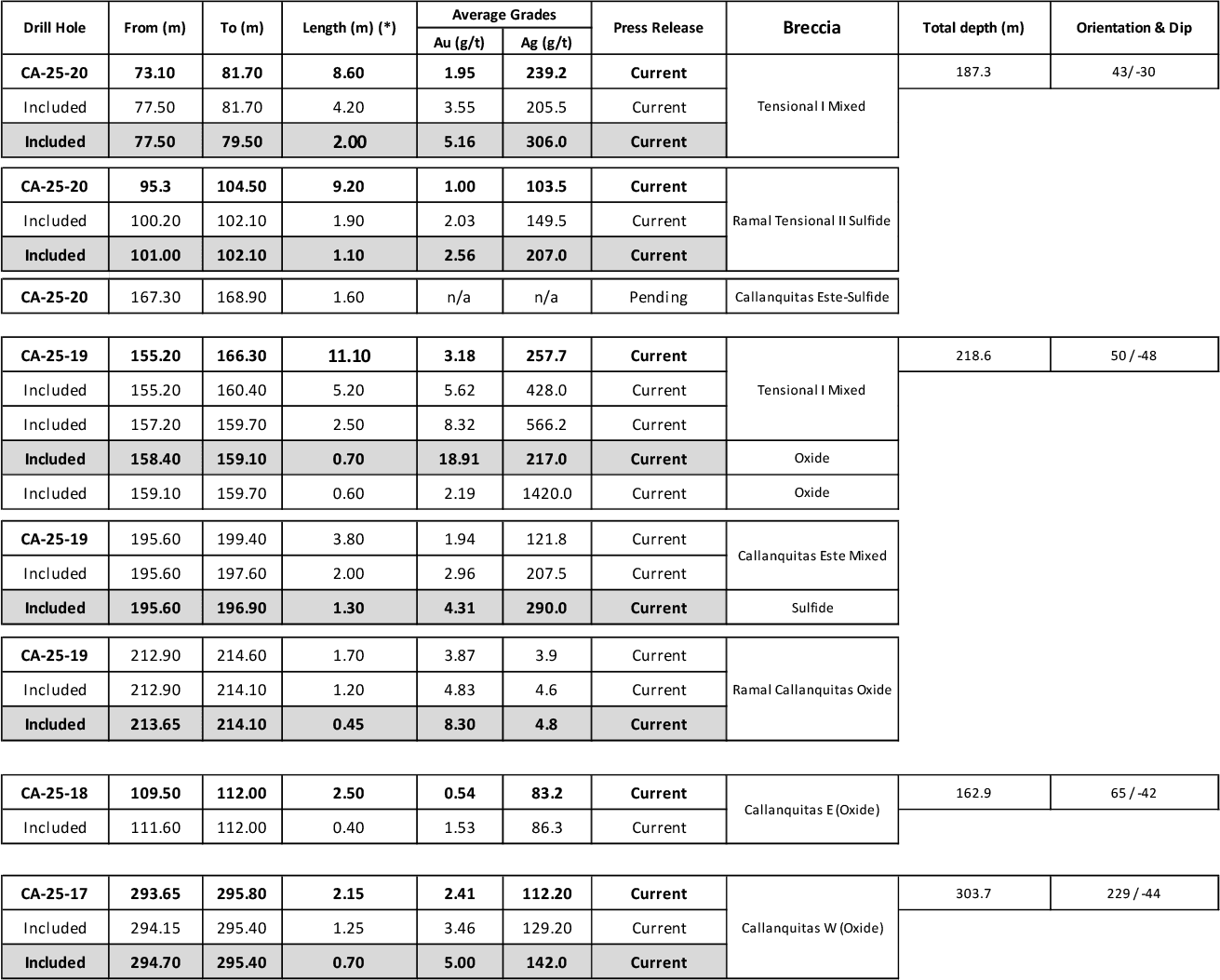 Drill hole CA-25-20 has identified three mineralized zones. The most significant includes an interval of 3.55 g/t Au and 205.5 g/t Ag over 4.2 meters, including 5.16 g/t Au and 306.0 g/t Ag over 2.0 meters. Additional assay results from the last section of this hole are pending. Drill hole CA-25-19 also intersected three mineralized zones, with the best interval returning 3.18 g/t Au and 257.7 g/t Ag over 11.1 meters, including 5.62 g/t Au and 428.0 g/t Ag over 5.2 meters. Drill hole CA-25-18 intercepted a mineralized section grading 1.53 g/t Au and 86.3 g/t Ag over 0.4 meters. At Callanquitas West, drill hole CA-25-17 intersected mineralization grading 5.00 g/t Au and 142.0 g/t Ag over 0.70 meters. (See Table 1).