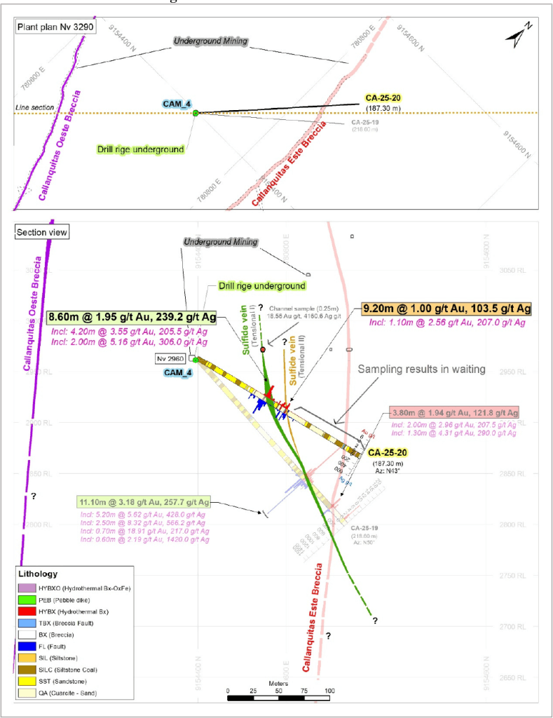 The drillhole CA-25-20 intercepted three mineralized zones, the first two mineralized zones the assay results are reported and the third mineralized zone at depth has missing assay results (sulfide zone). The grades are 1.95 g/t Au and 239.2 g/t Ag over 8.6 m, includes 5.16 g/t Au and 306.0 g/t Ag over 2 meters (mixed zone); 1.00 g/t Au and 103.5 g/t Ag over 9.20 meters, includes 2.56 g/t Au and 207.0 g/t Ag over 1.1 meters (sulfide zone).