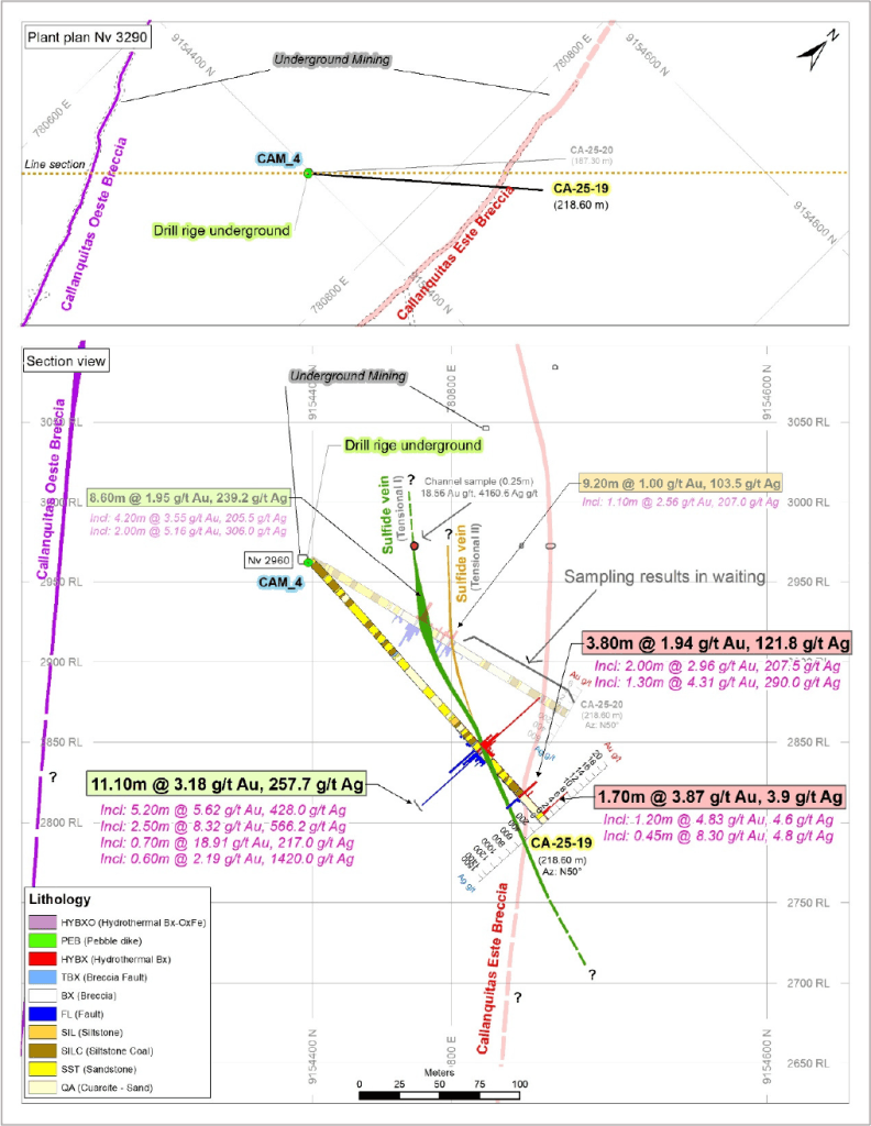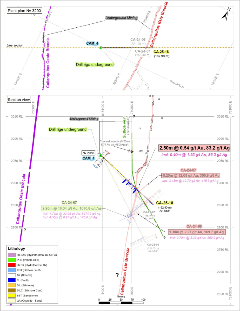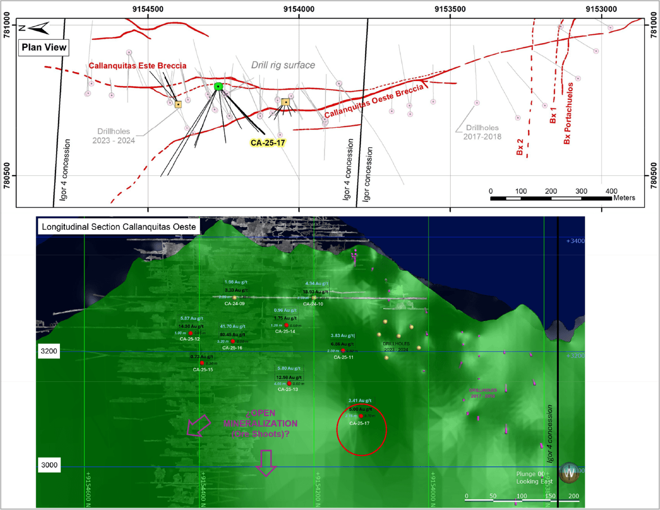 The intercept from drillhole CA-25-17 confirmed the continuity of the Callanquitas West breccia, grading 5.00 g/t Au and 142.0 g/t Ag over 0.7 m. The drillhole CA-25-17 confirms the significant mineralization in this northern area at 3,100 meters above sea level, demonstrating approximately 300 meters of mineralization trending from the surface.