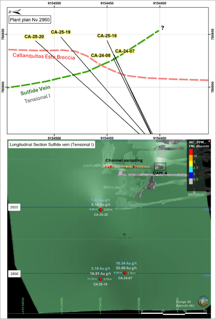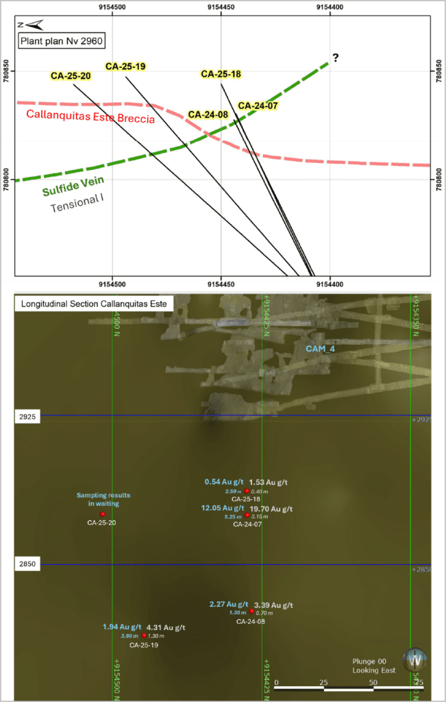 Holes CA-25-18, CA-25-19 and CA-25-20 were drilled from the chamber 04 located at an elevation of 2960 meters above sea level and intercepted the Callanquitas East structure and tensional veins with sulfide and mixed minerals. The intercepts of the three drill holes are located near the drill hole CA-24-07. See Figure 4: Plan view, Figure 5, 6, and 7 and Figure 8 Longitudinal Section.