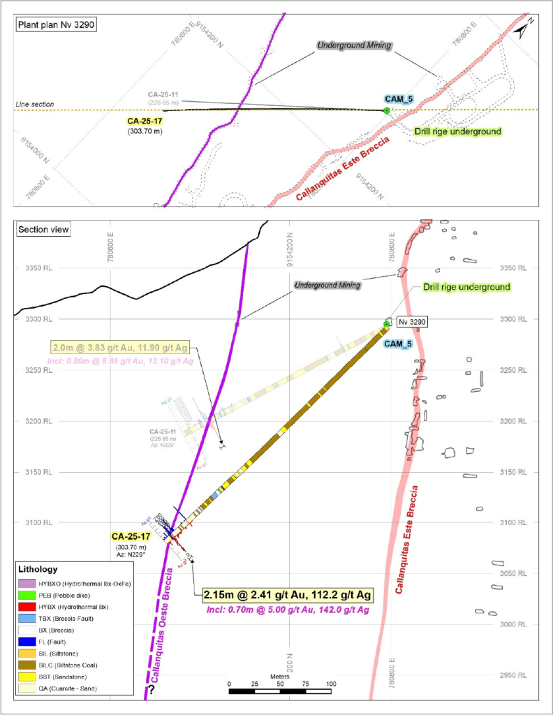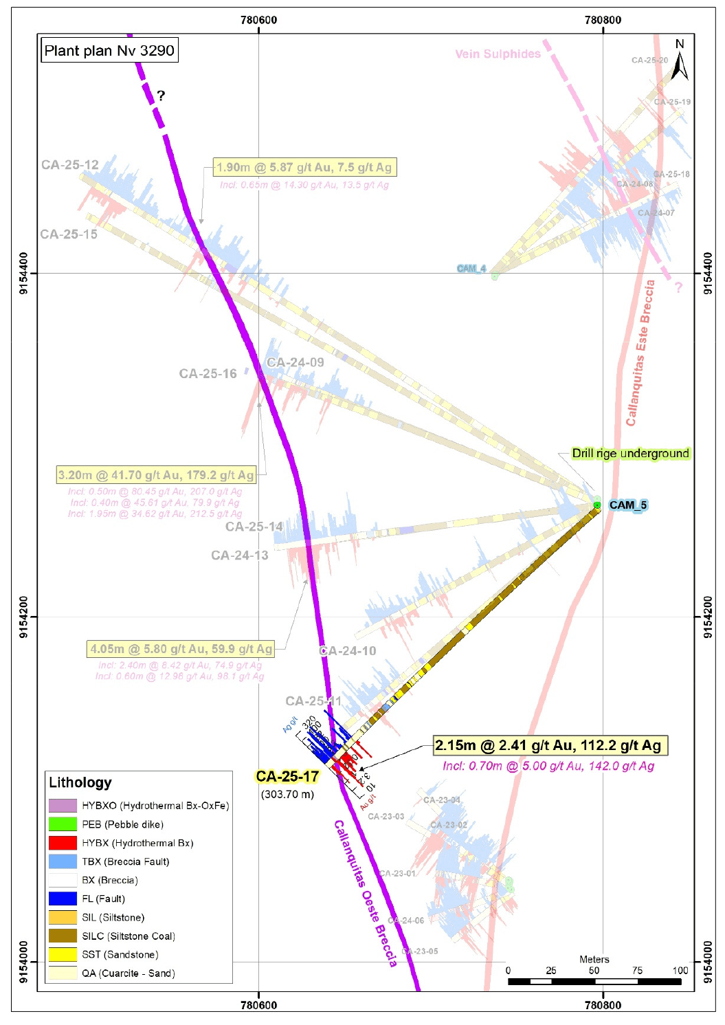 The drillhole CA-25-17 intercepted the Callanquitas West structure, located in the northern area of the historic drilling, and carried out in 2017 and 2024. The intercept of CA-25-17 is located 100 meters below the drill hole CA-25-11 and 100 meters south of CA-25-13 (See Figure 2 and 3, Section: drill holes and Longitudinal section).