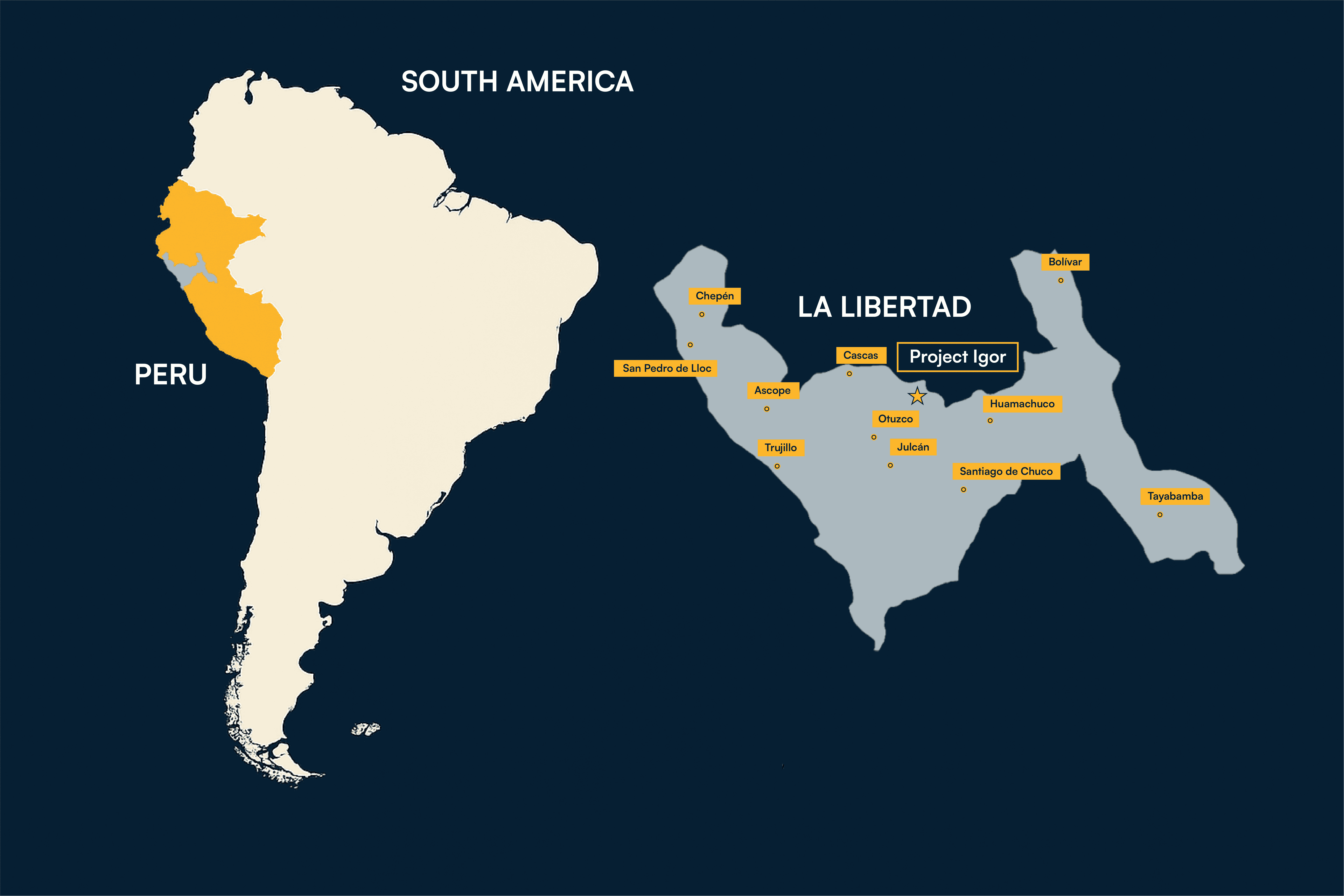 Igor is located in northern Perú in the Western Cordillera of the Andes, District of Huaranchal, Province of Otuzco, Department of La Libertad. Trujillo, a city of some 800,000 inhabitants, and the capital of La Libertad, serves as the point of departure when travelling to the project. Trujillo is 560 kilometres, a seven hour drive, or one hour flight, from Lima.