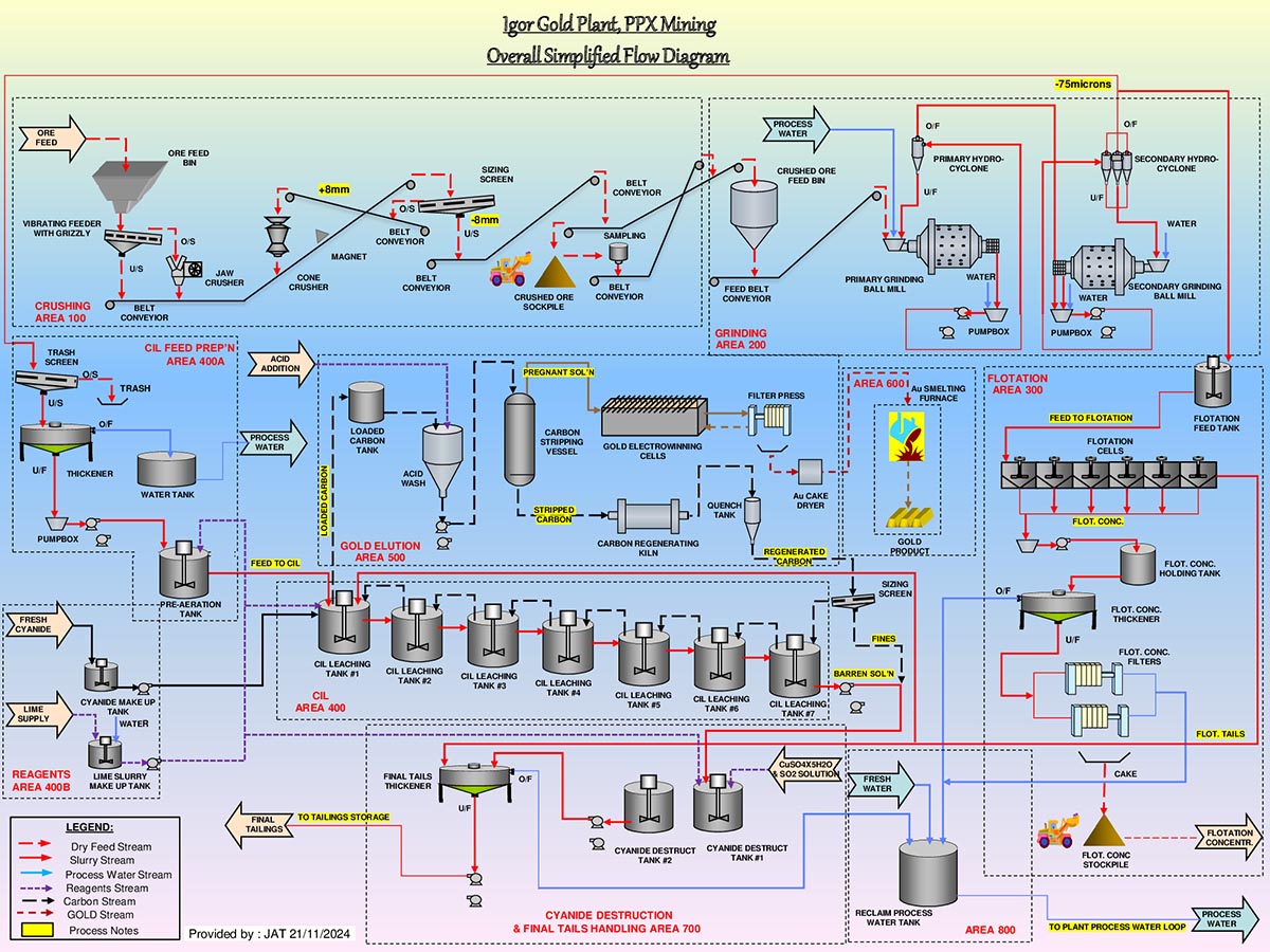 Both ore types will be crushed in a two-stage crushing circuit to a size of less than 12 mm. It will then be milled using two ball mills in closed circuit to a nominal size of 80% less than 150 microns. The milled product will pass to a thickener to increase solids concentration in the slurry. In the case of oxide ore, the first stage is to oxidize the iron associated with the ore in am agitated tank, with the addition of lime to raise the pH to 10.5. This is necessary to reduce the consumption of sodium cyanide. After which the slurry passes to a series of 7 tanks containing activated carbon and sodium cyanide is added to leach the gold and silver from the ore. The activated carbon adsorbs the gold and silver from solution and this carbon is removed from the circuit and treated to recover gold and silver by desorbing the valuable metals and precipitating them in a solid form using electrolysis. The precipitate is then smelted at high temperature and the gold-silver alloy, known as Dore bullion, is then sent to a refinery to produce high purity gold and silver which is sold. Using this Carbon in Leach process will obtain higher recoveries of gold than were obtained in third party plants, as the process greatly reduces the adsorption of gold by naturally occurring carbon in the ore.