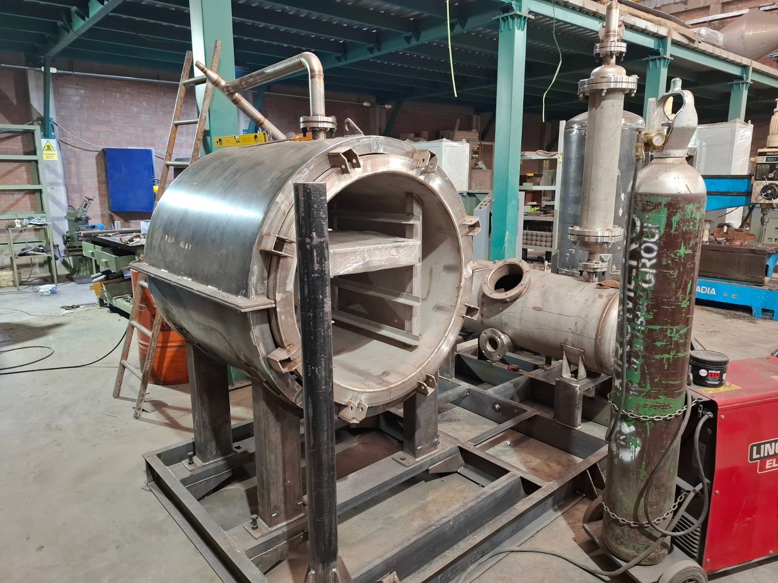 Elution column, awaiting pressure testing. There are two of these, they will operate at 1 40 – 150 degrees and gold and silver will be desorbed from “loaded carbon” producing a solution containing gold and silver. Behind is the storage tank for elution solution.