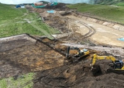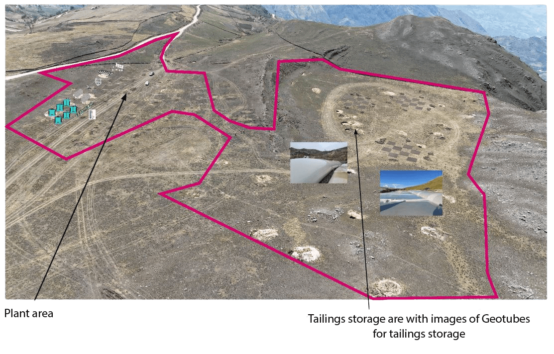 The site is a plateau situated some 4 km from the mine entrance, this is the nearest suitable land for the plant due to the mountainous nature of the region. The site is owned by a PPX subsidiary. A photograph of the site with the plant and tailings area shown is presented below. Note that instead of a tailings dam containing liquid tailings, Geotubes will be used which eliminate the potential for dam failure.