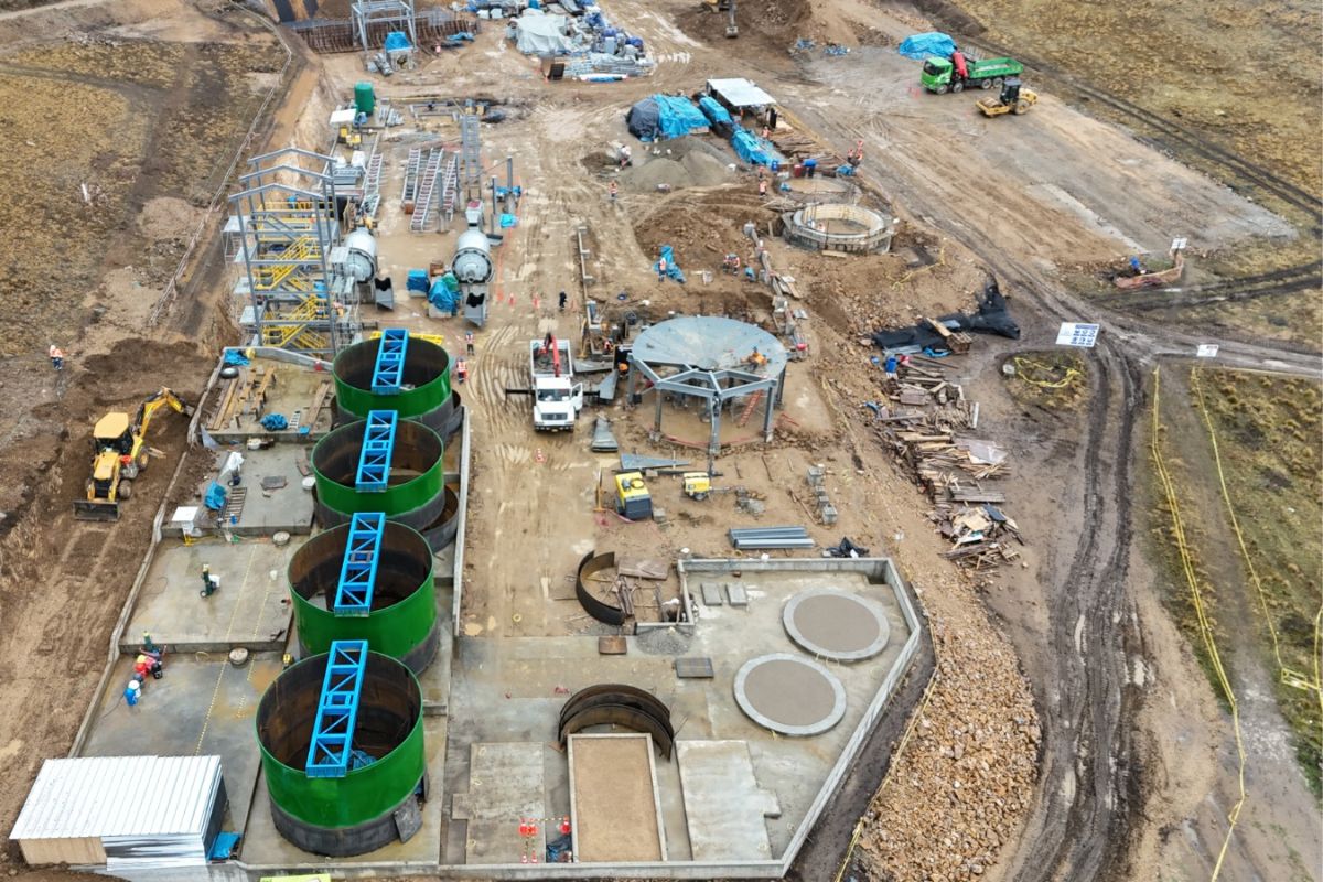 Plant Visit #2 - October 2nd 2025: Four leach tanks are nearing completion, as is the concentrate thickener to the right of the leach tanks. The two ball mills are also visible, and the tower to give the cyclones adequate elevation.